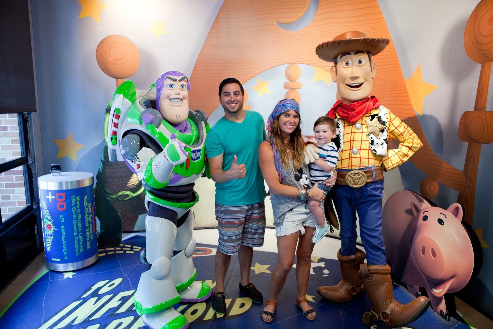 to celebrate landon's actual birthday we took him to the character breakfast at the beach club resort. i knew he would love it. pancakes and goofy? that's pretty much his heaven. he was able to meet donald duck. of course he grabbed his beak and his tail and i was fairly certain we were going to be kicked out due to him accosting a character. luckily he was quickly distracted by bacon and all was well. we then met goofy who is his favorite. right away he grabbed goofy's teeth and kept wanting to hug him. then came minnie, he tried to kiss her. which, now that i think about it makes sense why he now has some sort of eye infection going on. after breakfast we spent the day at hollywood studios meeting buzz and woody. watching disney jr. live and some stunt car show that i'm pretty sure rey wanted to see more than anyone. it was a great day spent with just the three of us.